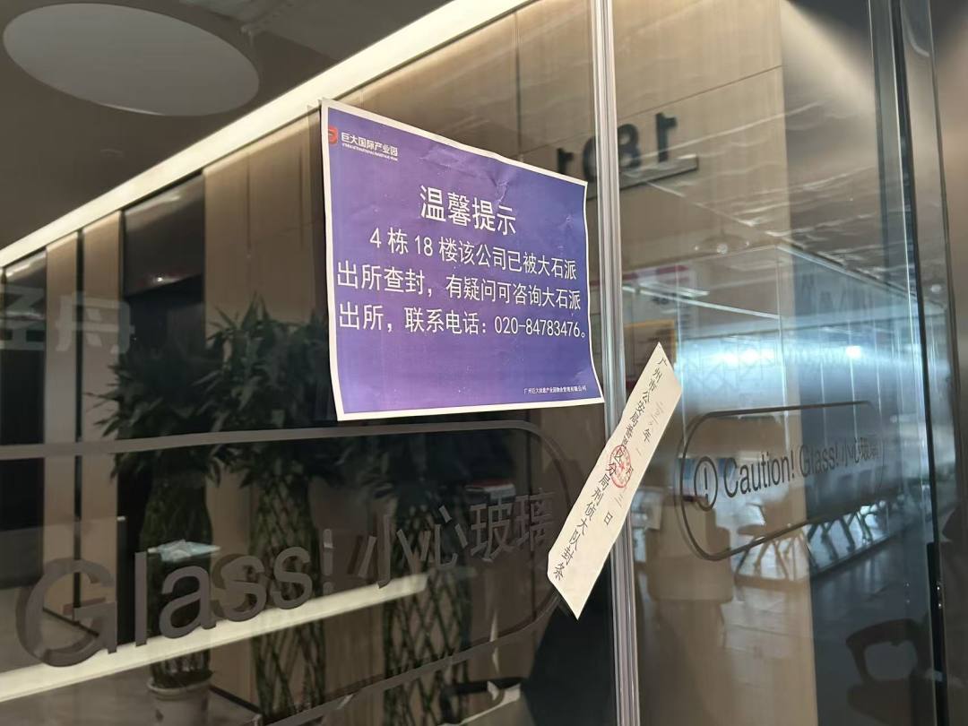 为核实情况,记者于1月28日前往轻舟公司的注册地巨大文化创意园4栋18楼进行探访。现场只见公司大门紧锁,已被广州市公安局番禺区分局刑侦大队贴上封条,一旁告示显示由大石派出所查封。办公区入口的打卡器已被拆除,透过玻璃门,那面“AI带货造福音,亦师亦友尽职责”的锦旗仍清晰可见。