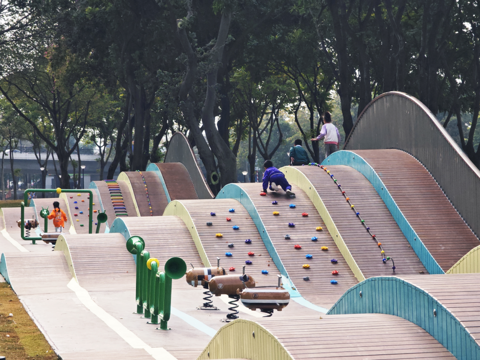 堤顶路不再是群众休闲娱乐阻隔,而是变成亲子互动连接的纽带。项目整合零散绿地,将原本单调的市政空间,变身为功能多元的带状公园。原来闲置的空地升级为2000平方米的全年龄段儿童友好乐园,低效绿地,建设成科普花境,四季有花可赏。林荫之下,开辟了8处康体健身广场,成为老年人的社交天地。从咿呀学语的孩童到安享晚年的老人,每个人都能在这里找到属于自己的乐趣。