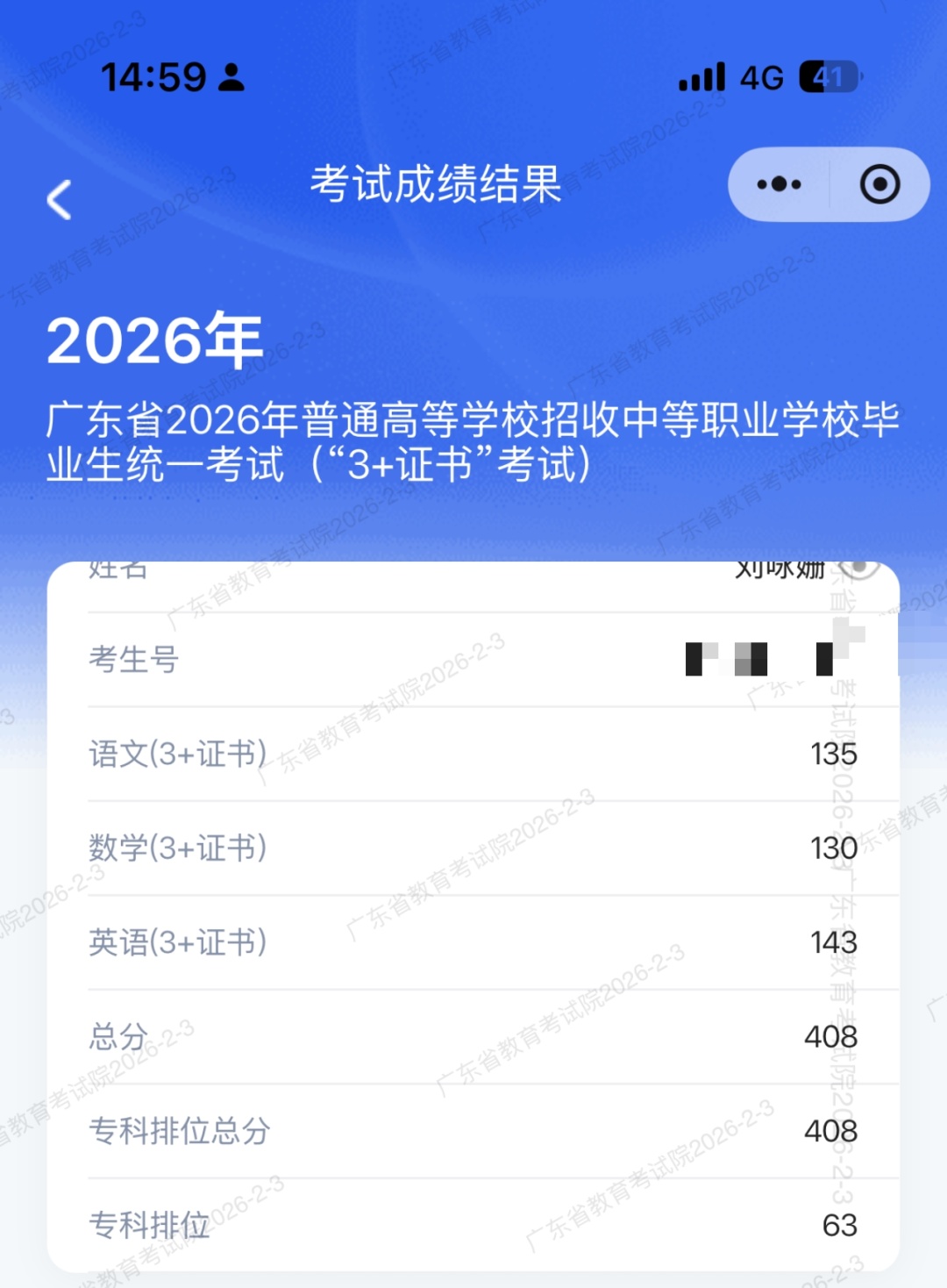 刘咏姗的“3+证书”考试成绩截图