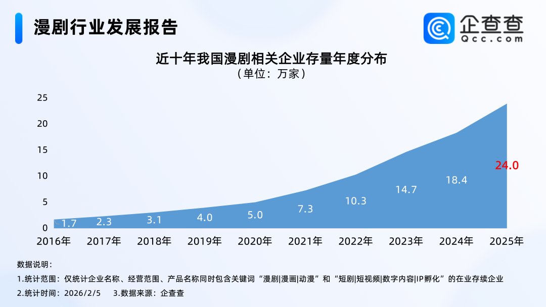 企查查数据显示,2025年全年,我国累计注册8.02万家漫剧相关企业,相比2024年同期增加37.1%;其中华东地区2025年相关企业注册量最多,占比32.2%,其次是华南地区,占比25.2%;截至2月5日,2026年我国已注册7307家漫剧相关企业。存量方面,近十年,我国漫剧相关企业存量逐年增加,截至2026年2月5日,我国现存24.5万家漫剧相关企业。