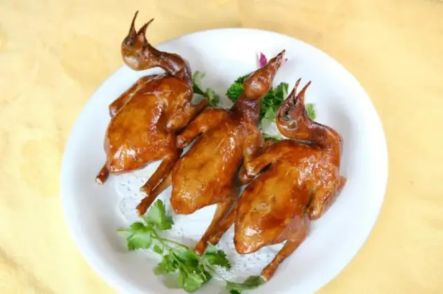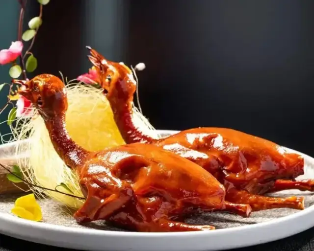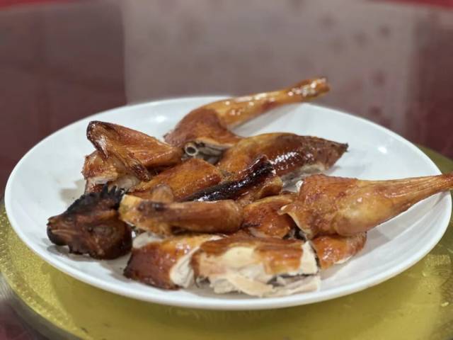 华记酒楼烧制的乳鸽,用传统的手艺制作的八两乳鸽,浸过特制的卤水后自然风干晾干,坚持即点即炸,将脆皮咬开后,藏在肉中的嫩汁即刻在口中绽开,渗到每个角落。