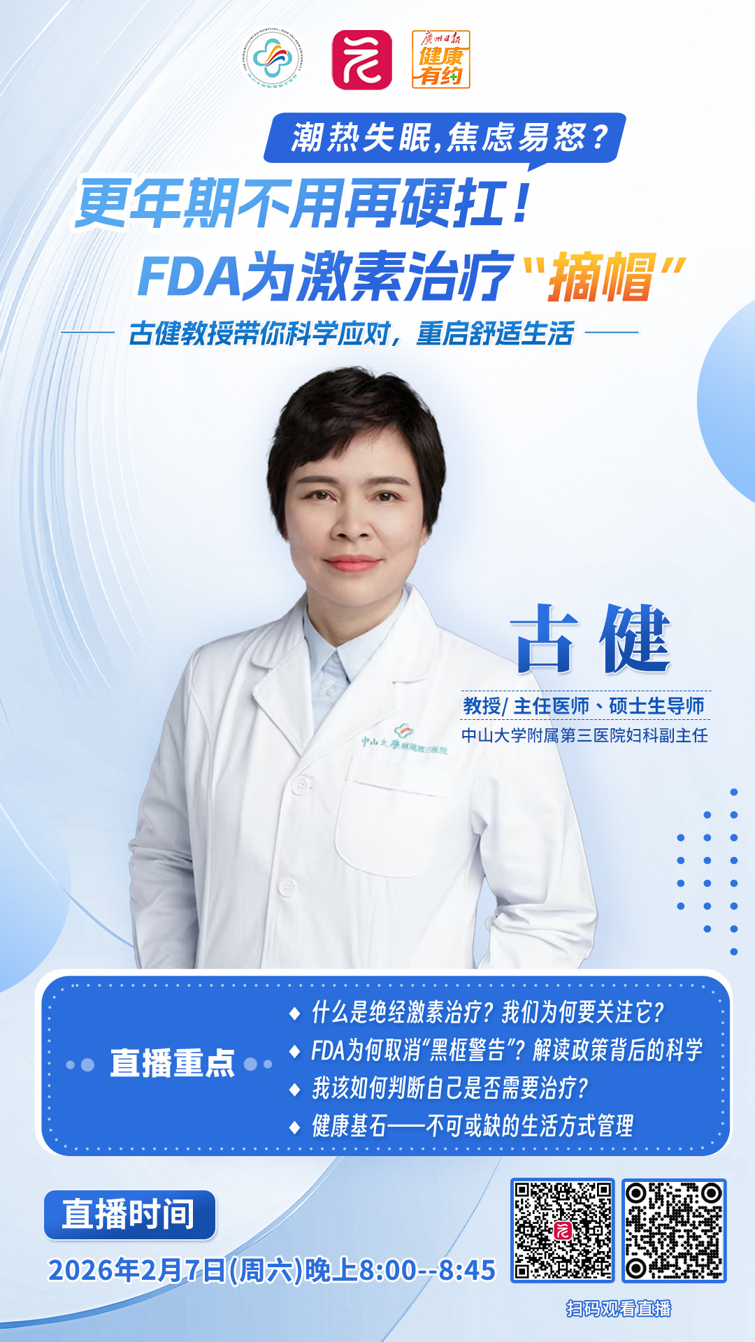 为了帮助女性正确应对更年期,2月7日(周六)晚上8:00—8:45,广州日报健康有约特别推出《潮热失眠,焦虑易怒?更年期不用再硬扛!古健教授带你科学应对,重启舒适生活》的名医微课,届时,中山大学附属第三医院妇科副主任、主任医师古健教授,将为大家深入解读FDA政策变化背后的科学依据,帮助大家正确认识更年期健康管理,并在现场答疑解惑,大家千万别错过!