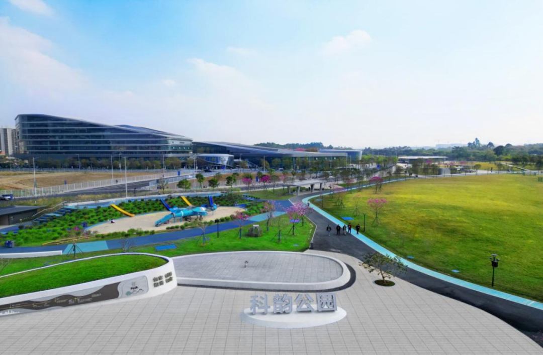 紧邻小鹏科技园的是刚刚落成的科韵公园(一期)。公园整体划分为科韵精神展示区、草坪活动区、儿童游乐区、生态景观区、运动休闲区、河涌景观区和配套服务区七大特色分区。