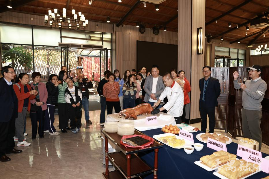走进汉景酒家,参访团实地考察了企业如何将“健康养生”理念与特色烹饪技艺深度融合的发展路径。现场,该企业展示了其精湛的专业烧烤和点心制作技术,其中尤以一只色泽金黄、外酥里嫩的特色烤猪及一系列精美点心备受瞩目,供参访团成员现场品鉴,收获一致好评。此外,参访团还参观了企业为提质升级而新投入建设的高技术烤炉。据悉,该烤炉总投资达60万元,将为企业后续研发如荔枝木烧鹅等更具特色与品质的烧烤菜品提供有力的技术支撑,展现了企业在传承中创新、以技术驱动品质升级的前瞻布局。