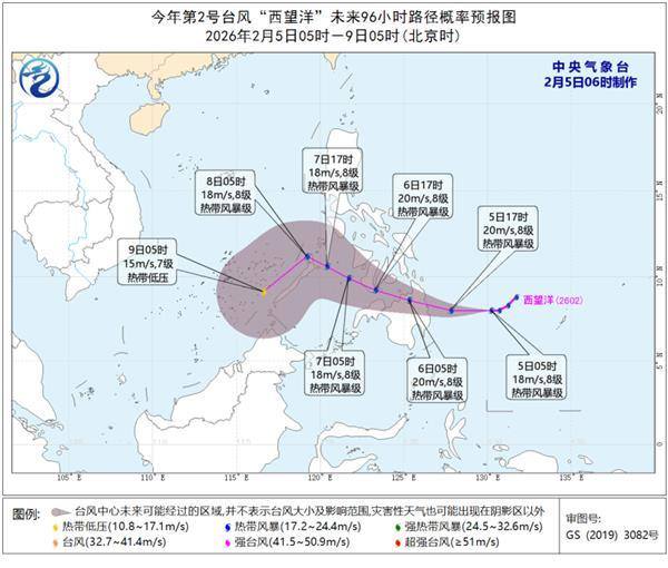 今年第2号台风“西望洋”(热带风暴级)的中心今天(5日)早晨5时位于菲律宾马尼拉东南方向约1240公里的洋面上,就是北纬8.0度、东经130.2度,中心附近最大风力有8级(18米/秒),中心最低气压为998百帕,七级风圈半径为180~320公里。