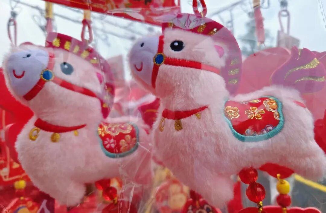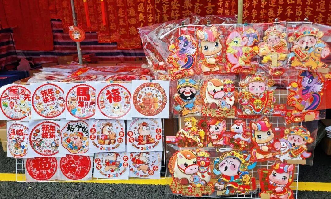 在石楼花街中心区域,连片的红色帐篷下是春联、挥春与文创摊位。红彤彤的春联、挥春、窗花等挂满棚顶,处处透着喜庆;憨态可掬的马年毛绒玩偶、萌趣的生肖挂饰、马造型的文创装饰物被整齐陈列;现场还有书法家设摊挥毫,街坊可现场定制手写对联。