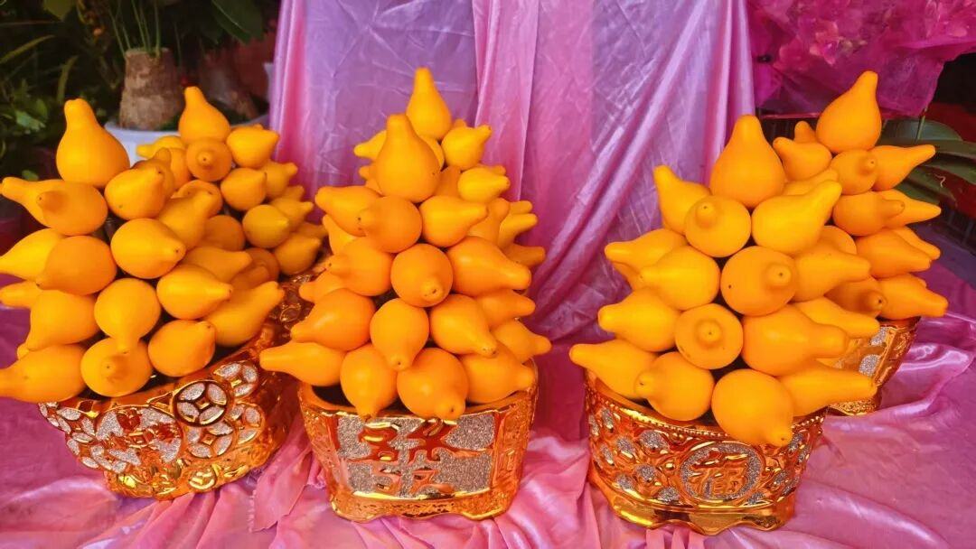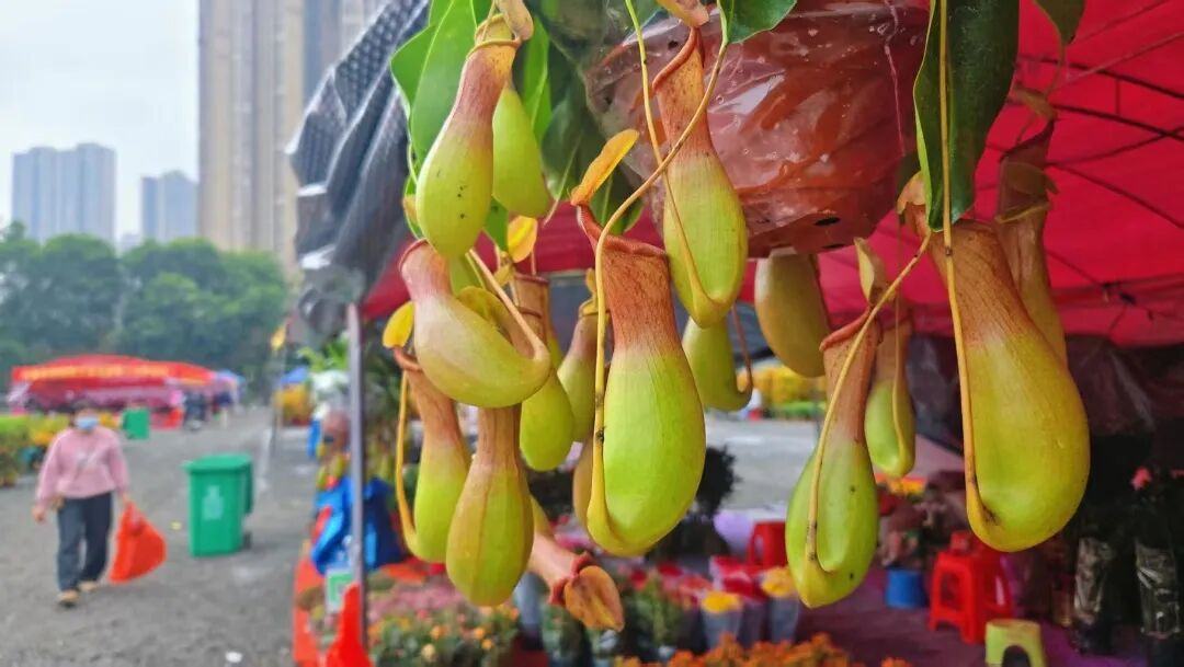 除了常见的年花,结满了苹果的盆栽苹果树、金灿灿的五代同堂果、寓意财源广进的猪笼草……也在花街中占据显眼位置,引人驻足。