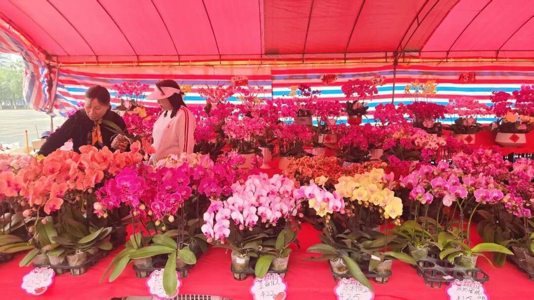 在一旁的年花摊位上,蝴蝶兰、月季、桃花、兰花、菊花等年宵花卉争奇斗艳。