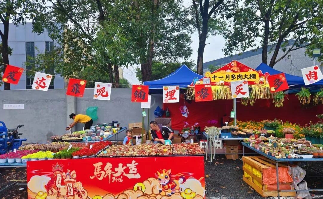 在石楼花市门口,首先映入眼帘的是巨型红色马年主题背景板,充满新春喜庆氛围,街坊们纷纷在此拍照打卡,祈愿“马年行大运”。