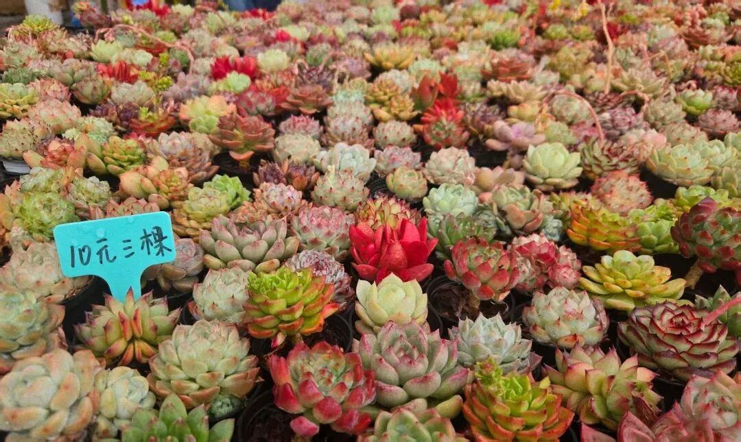 在年花档位中,一家卖多肉植物的摊位透着几分萌宠可爱,密密麻麻的多肉摆满了架子,胖乎乎的叶片像婴儿的小拳头,红边的、翠绿的、粉紫的,模样讨喜。多肉的生命力顽强,且价格适中,最低仅2元/棵,特别受年轻人青睐。