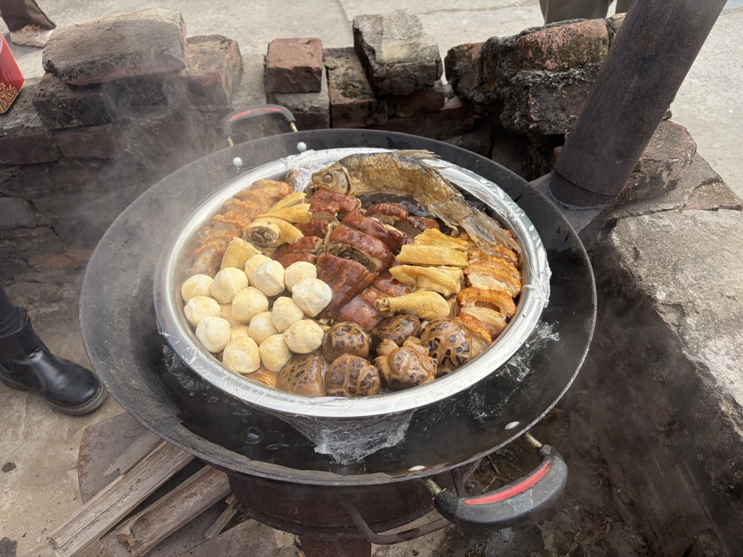 随着盆菜盖子的揭开,扣肉、腊肠、鹅掌、冬菇等各式食材在锅中翻滚,热气升腾、香气扑鼻。大家围坐一堂,品尝盆菜美食,举杯互道新年祝福。现场气氛热烈而温馨,老人们一边品尝美食,一边分享生活趣事,欢声笑语中洋溢着浓浓的幸福年味。