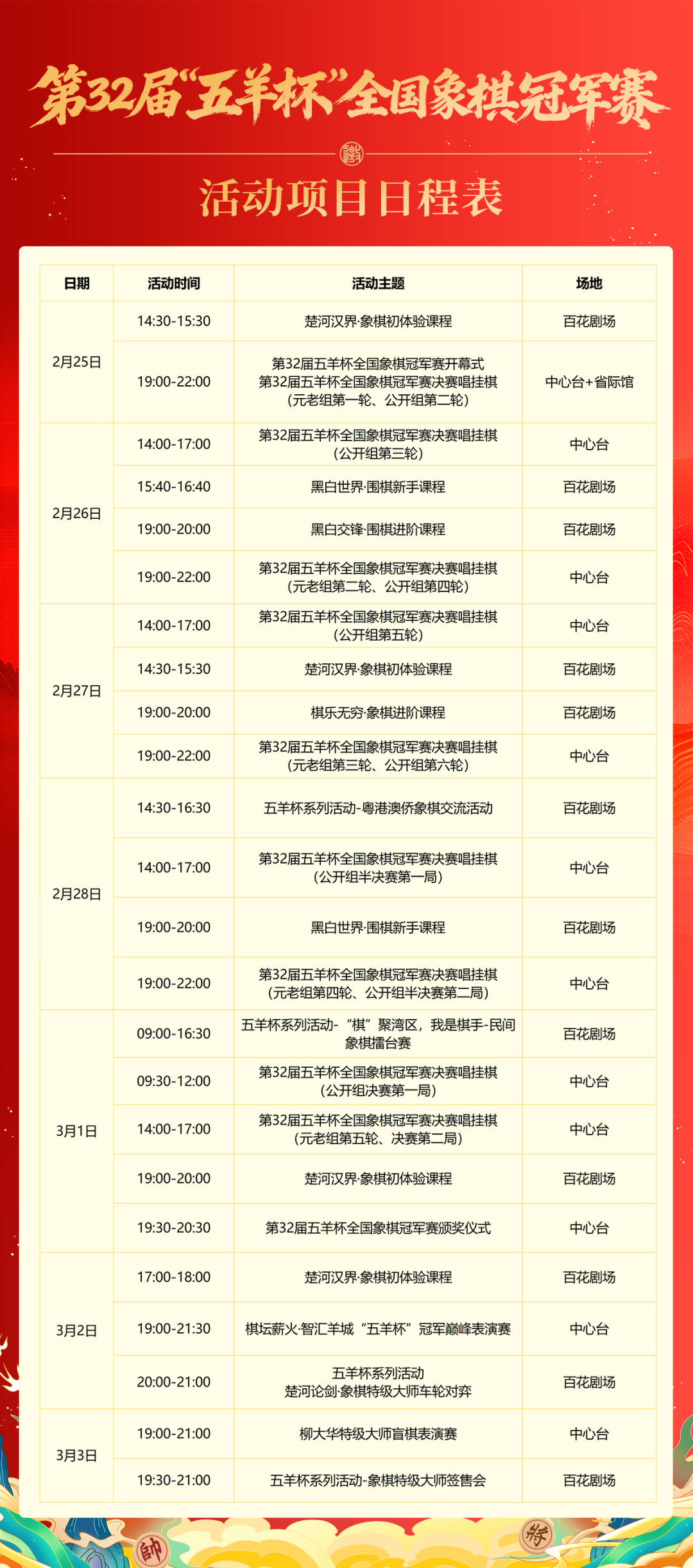 3月2日,在新春元宵节来临之际,公开组和元老组冠军将在广州文化公园中心台上演压轴的巅峰对决“表演赛”,为棋迷和游客增添节日氛围。