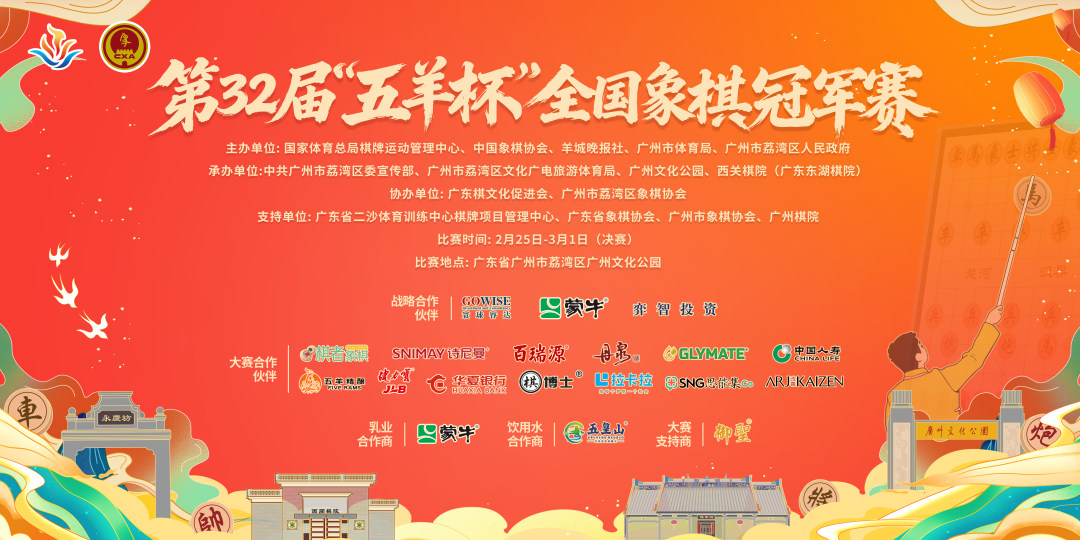 2月6日,第32届“五羊杯”全国象棋冠军赛新闻通气会在广州荔湾召开。“五羊杯”联合主办单位羊城晚报社、广州市体育局和荔湾区委区政府代表、荔湾区相关部门负责人出席。据了解,本届决赛及嘉年华活动将于2月25日(正月初九)至3月2日(正月十四)在广州文化公园举行,来自全国各地及海外的顶尖棋手将在广州文化公园展开巅峰对决,为全国棋迷和观众献上一场兼具竞技性、观赏性与文化性的象棋盛宴。