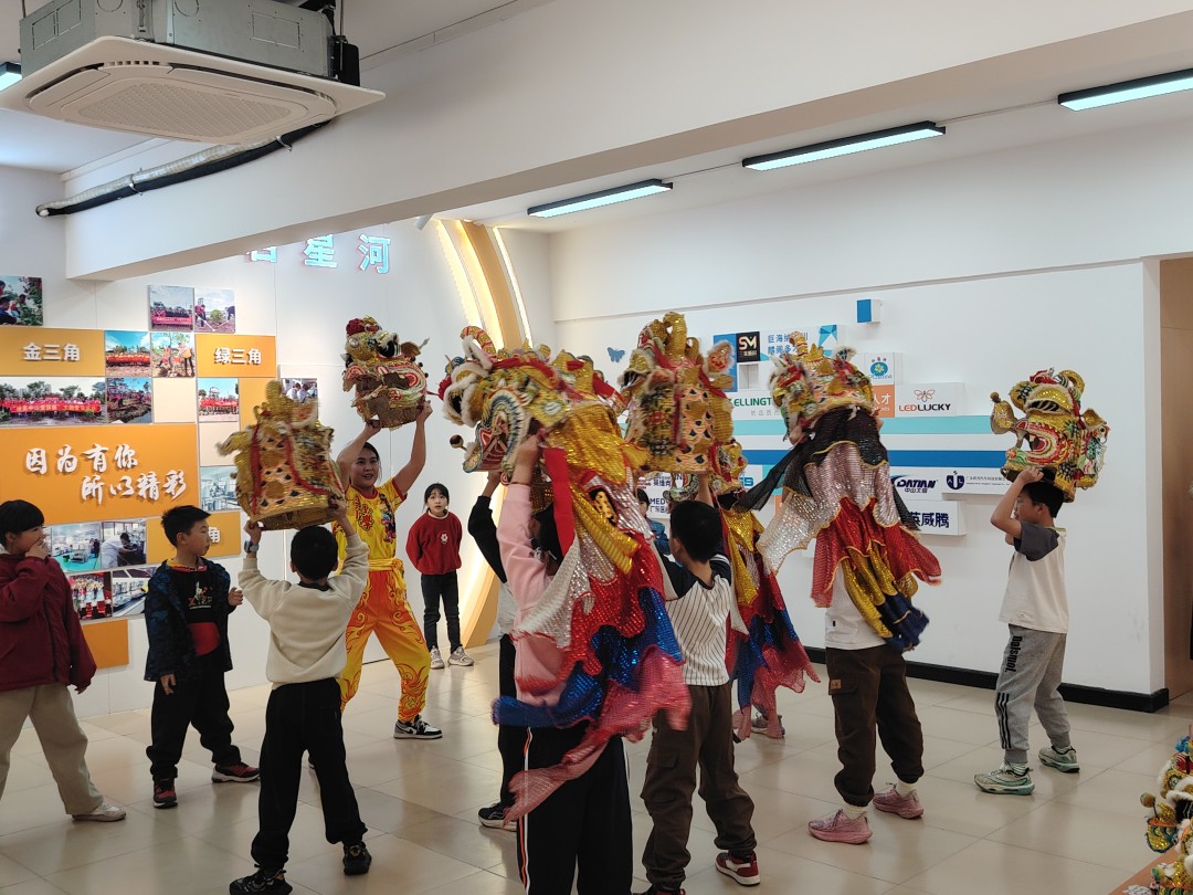 华南师范大学”百千万工程“突击队成员在中山三角镇福泽社区为“伙伴计划”爱心托管班学员进行麒麟舞教学。