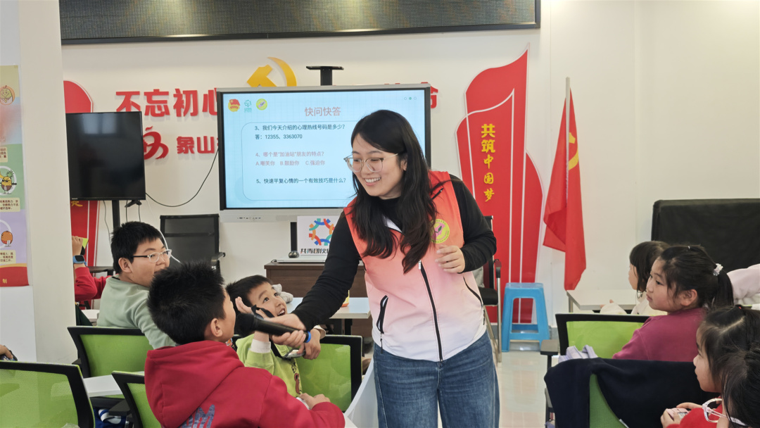 江门蓬江区 12355 青少年心理健康资深社工为“伙伴计划“爱心托管班学员科普心理健康知识。