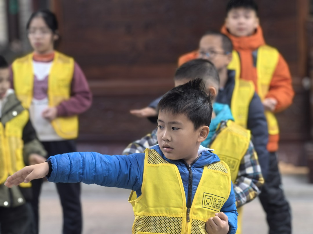 佛山顺德“伙伴计划”陈岩野先生祠爱心托管班学员学习咏春拳。