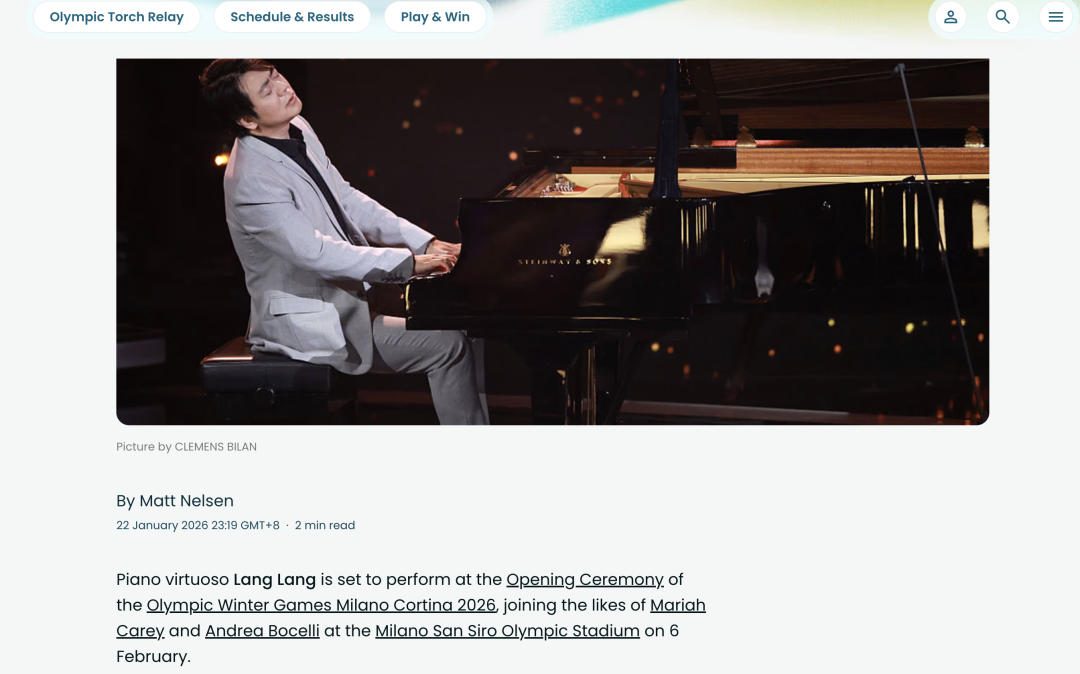 米兰冬奥会官网表示,郎朗将于2月6日在2026年米兰科尔蒂纳冬奥会开幕式上为世界观众献上精彩演出,与玛丽亚·凯莉、安德烈亚·波切利等同台献艺,延续他在多项重大体育赛事中登台表演的辉煌经历。