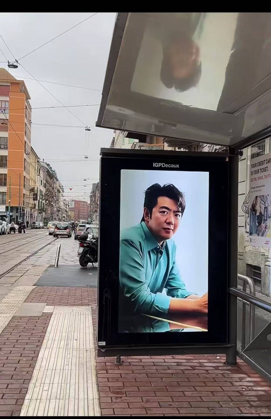 在米兰街头的公交站,郎朗即将亮相米兰冬奥会开幕式演出的广告牌。