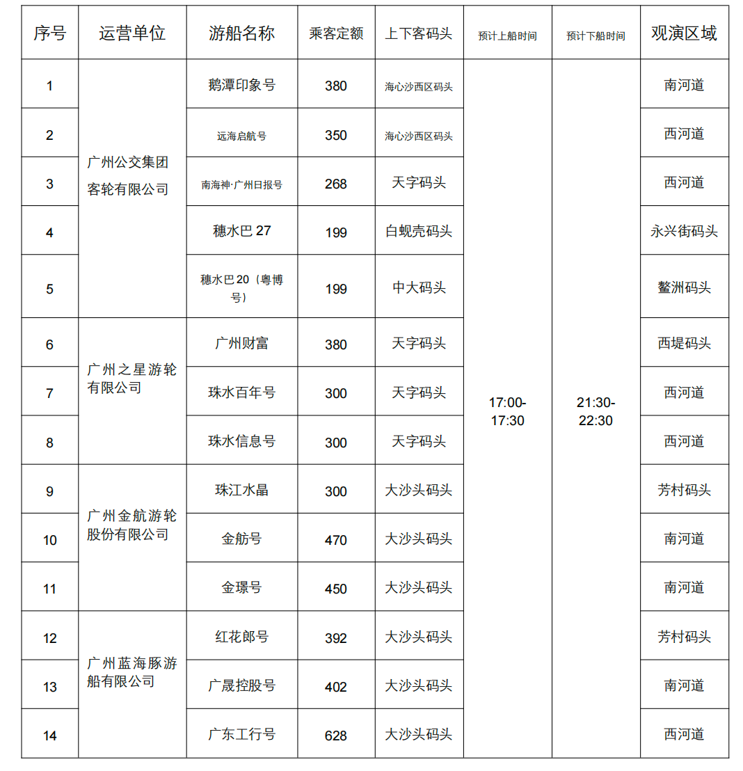 作为水上观演保障牵头单位,市港务局已统筹4家航运企业,筛选14艘合规游船投入服务,航线覆盖海心沙西区、大沙头、天字等多个码头,观演区域在白鹅潭附近的西河道、南河道及周围相关码头。所有游船均完成全面安全“体检”,船员接受专项培训与应急演练,全方位筑牢安全防线。