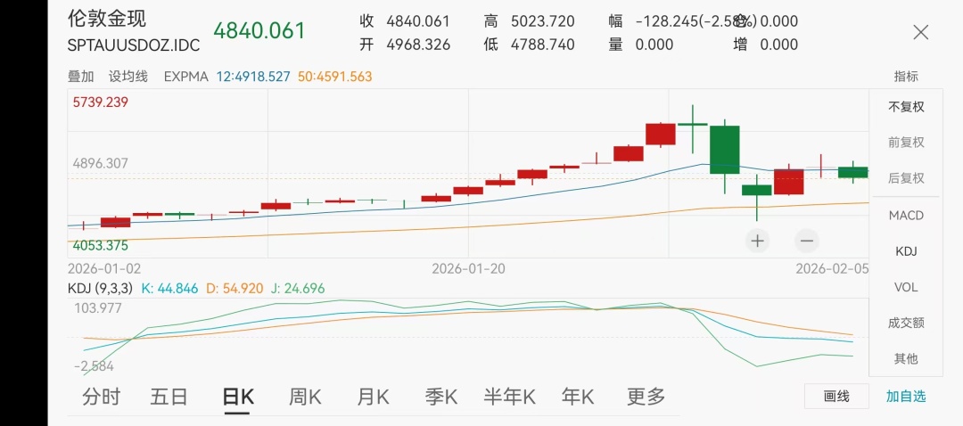 北京时间2月5日7时15分,伦敦金现大跌后直线拉升,重新站上5000美元关口;15时46分,报价4911.66美元/盎司,日内一度下探至4783.15美元/盎司,振幅超200美元/盎司。