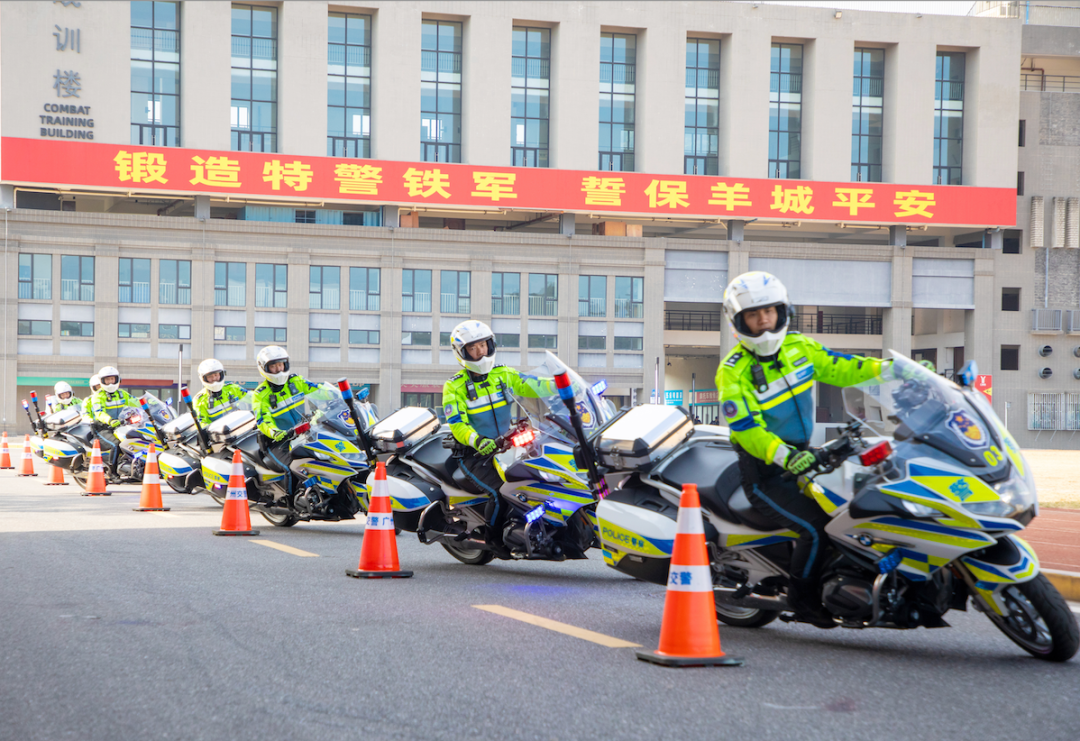 在擒敌拳演练环节,参训民警脚步沉稳、拳风猎猎,充分展示了精湛娴熟的格斗技巧;摩托车驾驶技能演练中,铁骑队员大展车技,完成绕桩、对向行驶、慢速通场等专业动作,充分体现羊城铁骑的实战适配能力;警犬训练科目现场,训导员通过手势、口令完成指令传递,警犬快速响应、精准出击……
