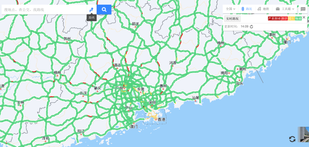 广东交警透露,截至2月7日14时许,全省高速缓行路段有:广佛肇高速公路(肇庆市高要区西角立交至禄步镇)、京港澳高速公路(清远市佛冈县汤塘镇)、广连高速公路(清远市阳山县青莲镇至新田隧道)、二广高速公路(肇庆市广宁县石门隧道至广宁互通、肇庆市广宁县宾亨收费站至坑口大桥)、深岑高速公路(佛山市高明区高村立交至更合镇、深圳市宝安区航城街道至鹤洲收费站)等。