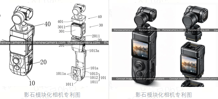 模块化设计:影石已提交模块化手持云台相机相关专利申请,支持镜头与屏幕部分分离,以拓展更多拍摄场景与创意玩法。
