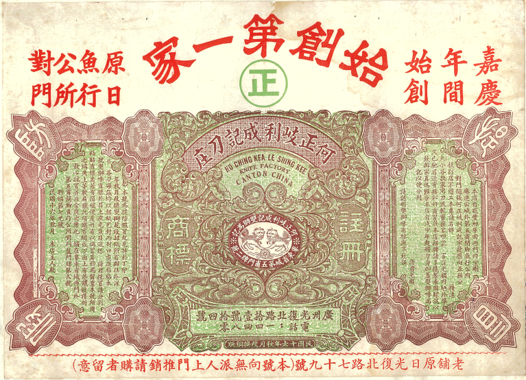民国十六年(1927年)何正岐利成记刀庄的“双狮”注册商标及印制的广告