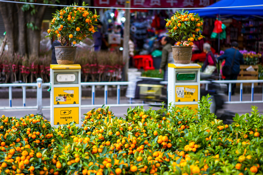 成行成列摆放的年桔,吸引路过的居民的注意。