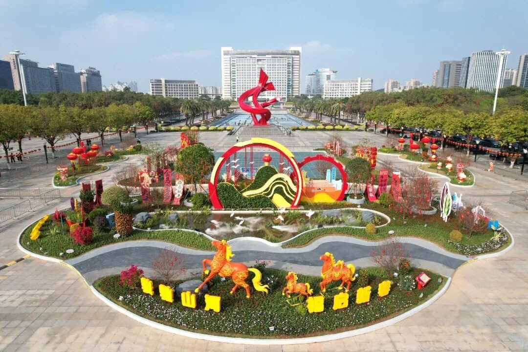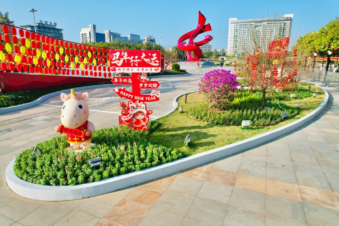 本次春节花坛以“福启新元盛、马跃莞邑春”为核心主题,在2024年国庆花坛框架基础上,精心打造4组立体花坛景观,总占地面积约1500平方米,将马年奋进精神与莞邑文化底蕴、城市发展特色深度融合。