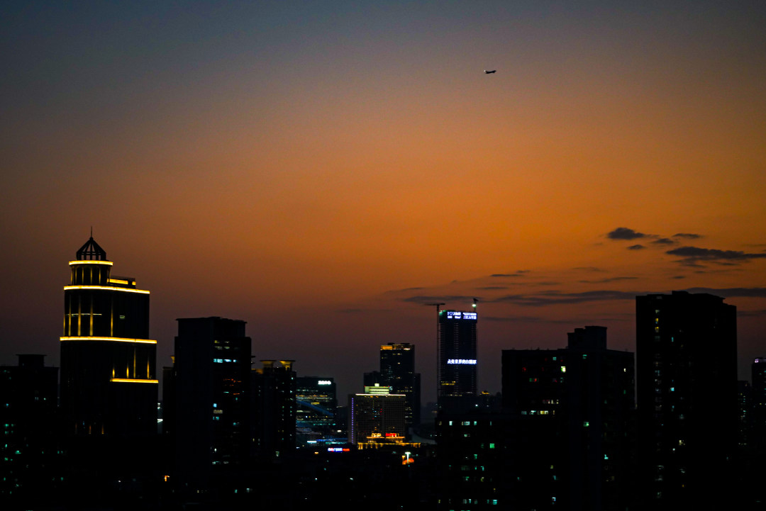 晴冬傍晚,暮色四合之时,城市西边的天际线展现别样的温柔。