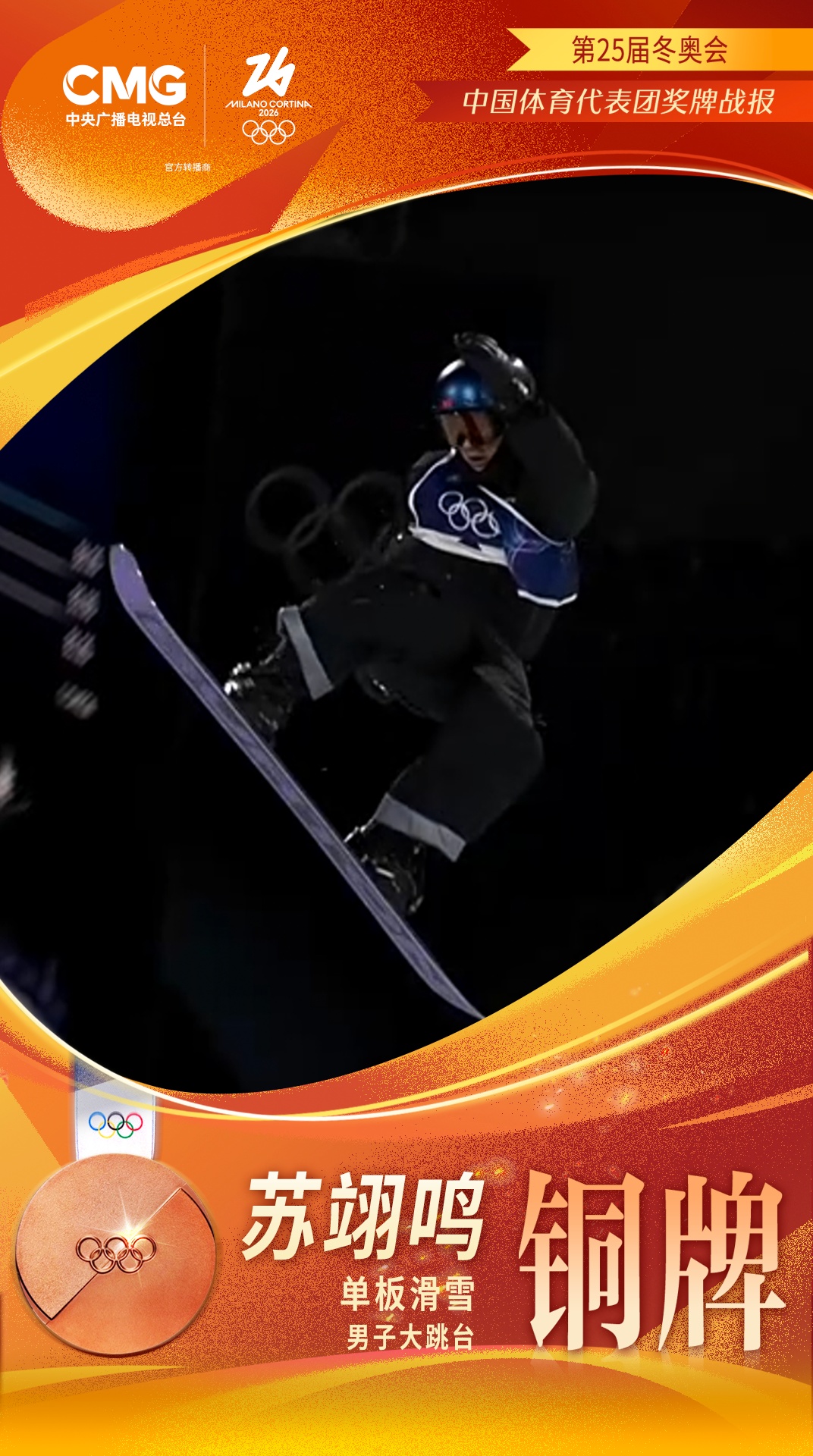 苏翊鸣获得米兰冬奥会中国代表团首枚奖牌