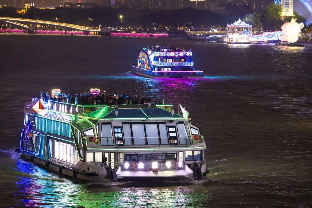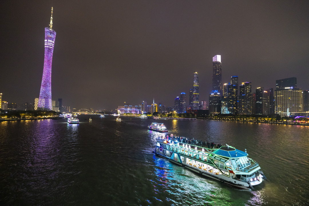 APEC嘉宾乘坐“全运号”夜游珠江,欣赏广州珠江夜景。