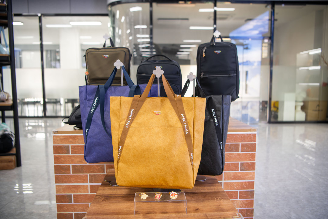 走进汇桐实业样品陈列室,只见各种各样的包包琳琅满目,让人目不暇接。其中,黑色、藏蓝、黄棕三个不同颜色的APEC2026环保公文袋被放在醒目位置。公司总经理张宣浩的讲述,将我们拉回到2025年末。