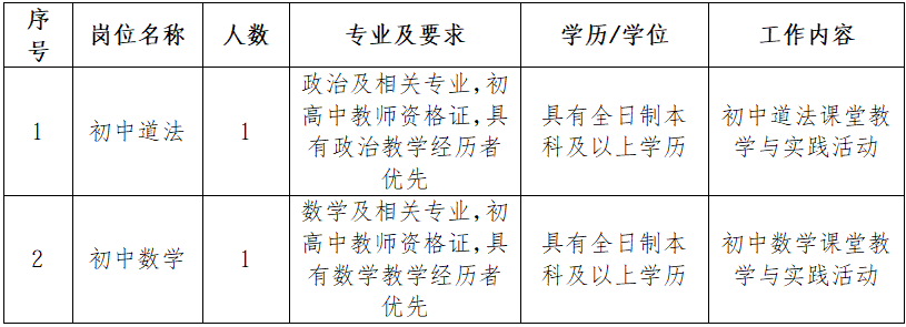 根据工作需要,广州南沙人力资源发展有限公司联合广州市南沙第一中学面向社会招聘编外初中道法、初中数学教师各1名。报名时间为即日起至2月24日下午18:00止,报名人员登录南沙优聘网(https://www.nsrcup.com/notice/)查看本招聘批次,按照操作指引进行报名。
