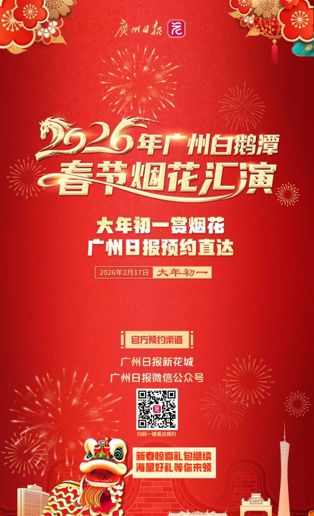 【2026春节烟花汇演预约开放!广州日报新花城预约攻略来了】2026年广州白鹅潭春节烟花汇演将于2月17日(大年初一)晚在白鹅潭江面举行,17个观演区共约18万个名额,继续实行预约抽签制;广州日报新花城作为官方指定预约渠道之一,已经正式开放预约,预约开放时间至2月10日23:59,点击下图或识别二维码参加,快来预约!