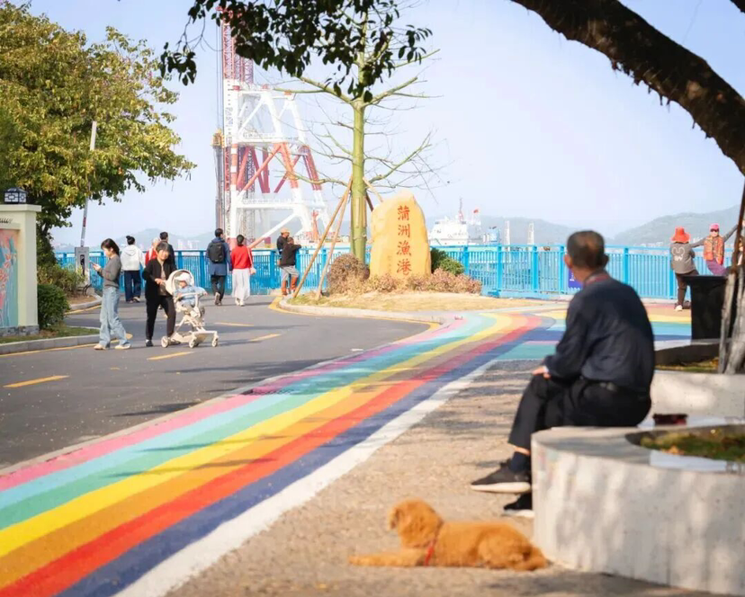 沿着彩虹路漫步,阳光洒在波光粼粼的海面上,远处的船只来来往往,勾勒出一幅充满生机的海港画卷。蒲洲渔港,渔船静静停泊在彩色墙绘前,醒狮与海浪在壁画上共舞,这里没有渔港的喧嚣,只有海浪与灯光的温柔交响。