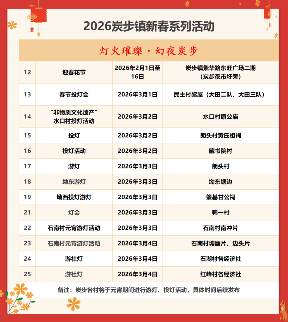 春节临近,年味在街巷间悄然弥漫。还在为去哪寻找地道的广府年味发愁吗?来广州花都炭步,这个春节,这里化身新春欢乐场,“活力跃动・燃情炭步”“平安守护・心安炭步”“墨香年味・雅韵炭步”“艺彩纷呈・乐享炭步”“灯火璀璨・幻夜炭步”五大板块30余项活动轮番上演,从元旦启幕到元宵收官,沉浸式感受岭南古镇古村的新春魅力。