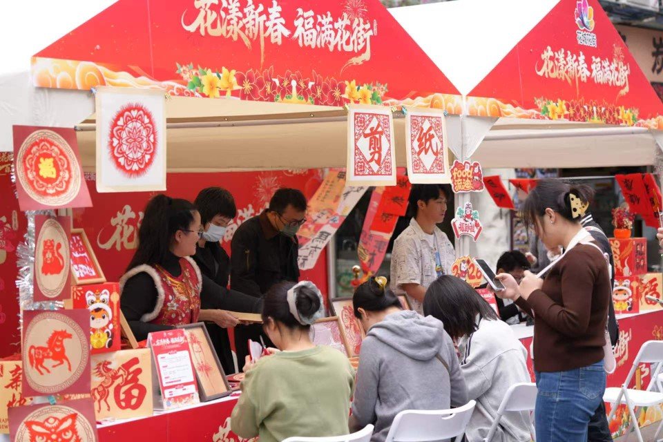 2月7日,“花漾新春,福满花街”新春游园会进一步深化沉浸式年俗体验。活动设置四大互动摊位:糖画手艺人以糖为墨勾勒鲜花与生肖,传递“甜蜜过年”的祝福;春联书写融合广府年俗与花卉元素,让墨香与花香交织;剪纸窗花融入岭南花卉图案,展现非遗技艺的镂空之美;主题打卡点则让游客带走与花同框的春节记忆。此外,百年花市文化展以图文形式梳理“千年花城,百年花市”的历史脉络,增强文化认同感。