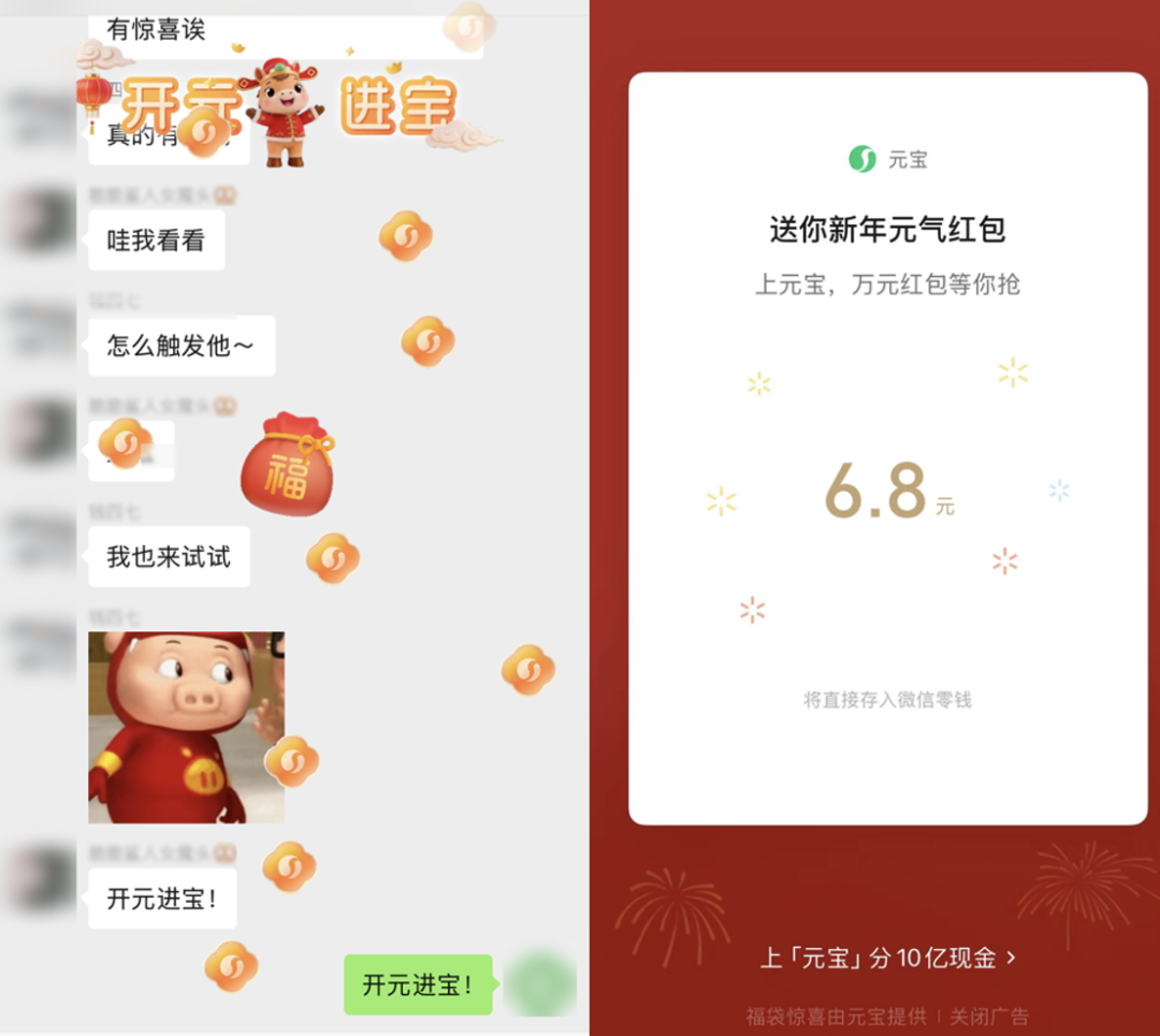 除了在元宝派里能抢红包,在微信里聊天,也有机会掉落红包。2月10日至2月16日期间,在微信对话框输入特定关键词,就可以触发元宝定制红包雨,有机会抽中现金红包。