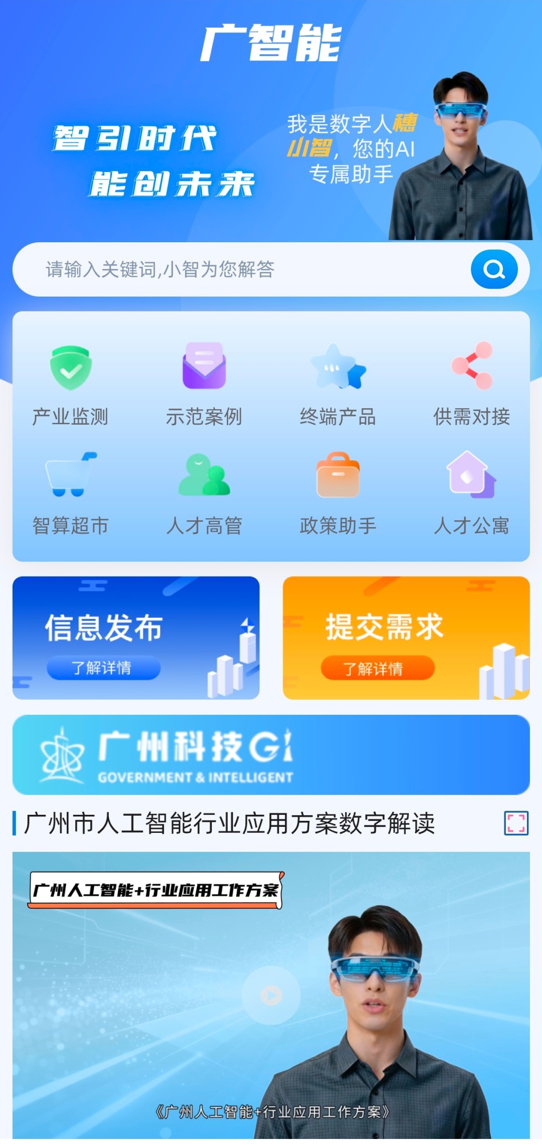 为进一步提升用户体验,平台基于国内领先的通用大模型推出“智能问答”功能。用户无论想找案例、寻终端、觅场景,还是找人才、查政策,只需输入关键词,AI助手“穗小智”就能快速响应。此外,数字人“穗小智”还会提供政策解读服务,对《广州人工智能+行业应用工作方案》等最新政策文件进行动态解读并在首页展示,让用户及时了解政策动态。