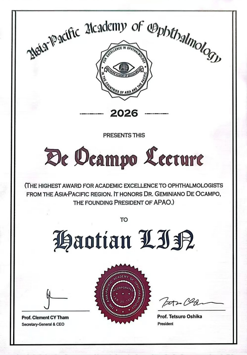 林凤彬(主治医师)获得APAO Achievement Awards,他专注于高度近视合并青光眼的早期鉴别难点研究,其工作为在高危人群中有效开展青光眼早期筛查的临床实践提供了关键支持。