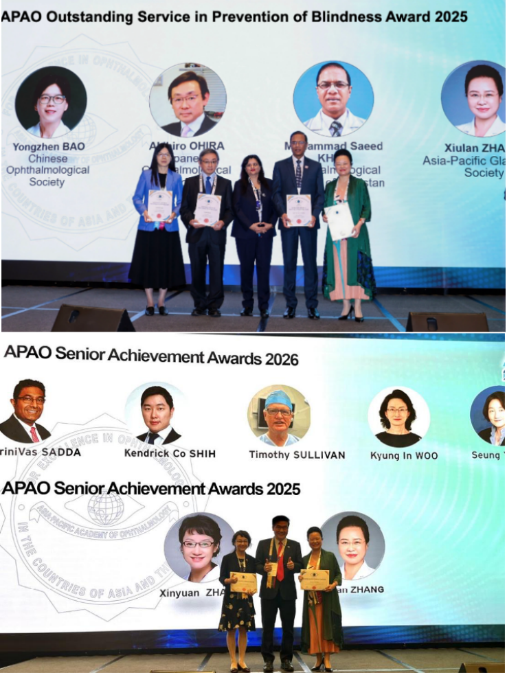 张秀兰教授同时荣获APAO Outstanding Service in Prevention of Blindness Award(亚太眼科学会杰出防盲贡献奖)与APAO Senior Achievement Award(亚太眼科学会杰出成就奖)。她在青光眼人工智能、影像学、基因治疗及微创手术领域的开创性研究,尤其是牵头构建的青光眼智能筛诊平台与首创的“超”微创手术体系,深刻影响了全球青光眼的临床实践。