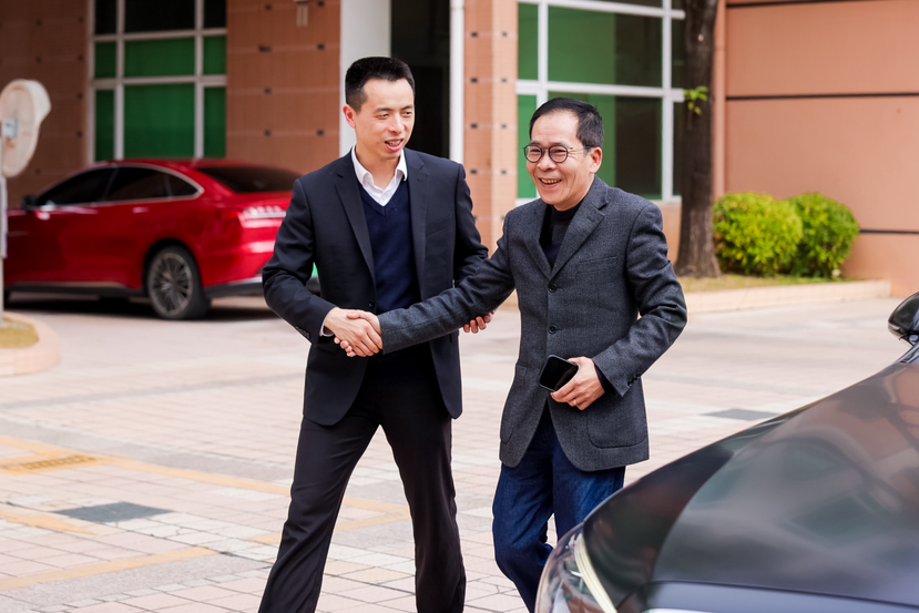 顺德区副区长、容桂街道党工委书记陈振浩(左)迎接容桂总商会会长黄淼(右)