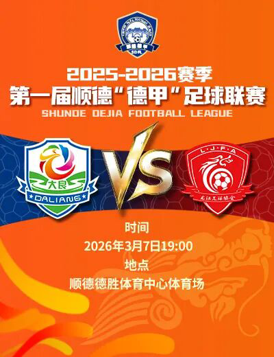 首届“德甲”揭幕战,将在2026年3月7日19:00—21:30举行,地点为顺德德胜体育中心体育场。大良双皮奶力酒队将对战龙江家具队,正式打响“德甲”足球联赛。