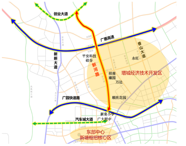新河路北接创业大道,南连汽车城大道,直接贯通上述两大重点区域。通车后,可有效分流新新大道、香山大道的过境车流,并通过连接广惠高速可分流前往广州中心城区的交通压力,显著缓解广园立交及荔新快速路等关键节点的拥堵状况,提升路网韧性和通行效率。同时,道路极大缩短了周边社区、学校的通勤距离,切实解决居民出行“最后一公里”的痛点。