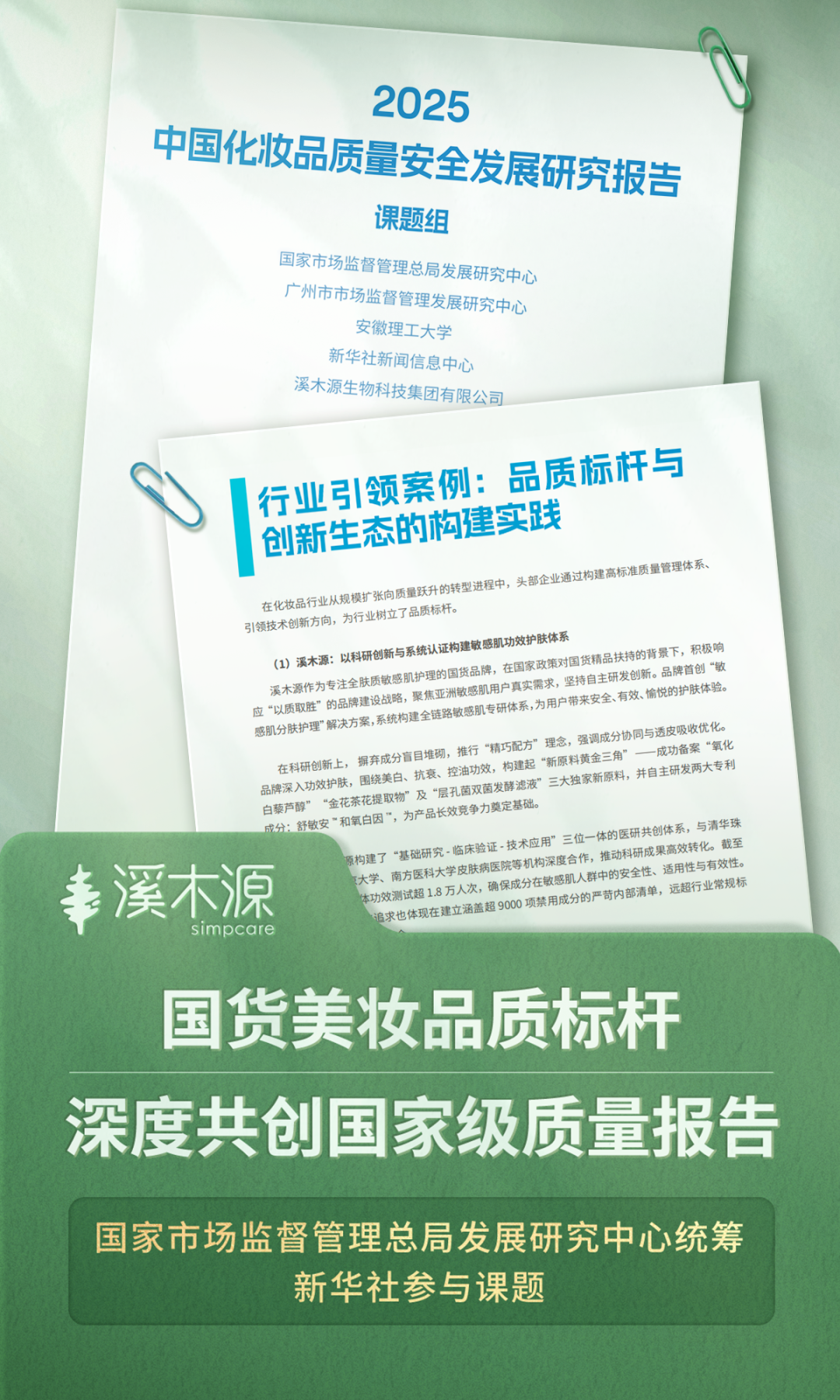 日前,国家市场监管总局发展研究中心在京召开化妆品行业高质量发展研讨会。作为国货美妆品质标杆案例,溪木源正式入选《2025中国化妆品质量安全发展研究报告》。