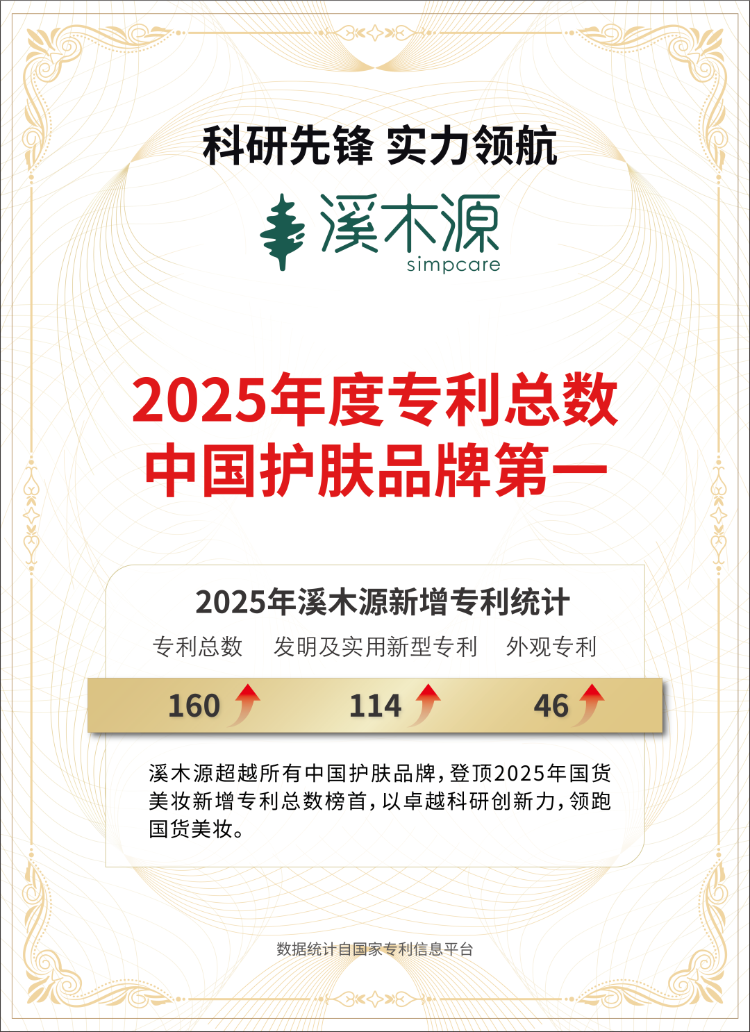 数据显示,截至2026年1月底,溪木源累计获得专利授权及申请471项,且2025年新增专利总数达160项,位居中国护肤品牌首位。自品牌创立以来,累计完成超过1.8万人次的人体功效测试及近1200项人体临床验证,全面保障产品在安全性、功效性及使用肤感上的综合表现。