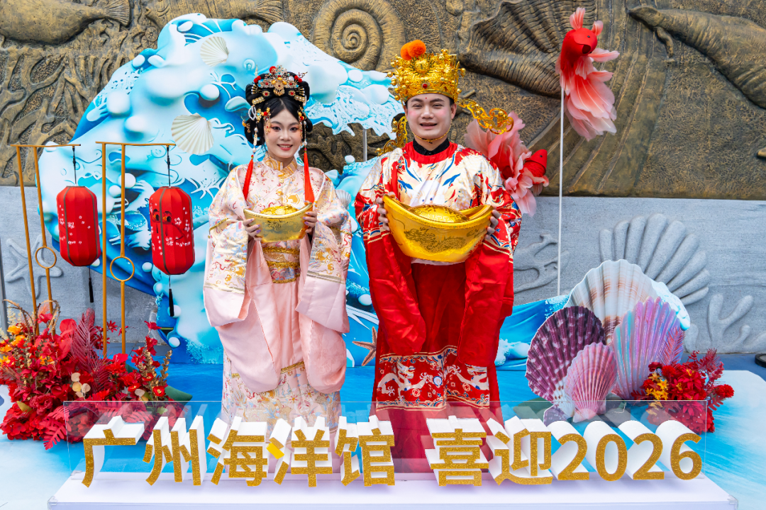 在陆地上,欢乐财神、天仙财神等NPC,将通过舞蹈、魔术、滑稽戏等形式和游客亲密互动;在水下,广州海洋馆精心设计的新年美人鱼秀《鳌珠献瑞 五财临门》精彩上演,讲述了海底“海韵财神”与五位人鱼财神使者为人间送祝福的故事,巧妙融合传统民俗与深海奇景,让游客仿佛穿越到神话之中。人鱼舞者还会化身福娃、哪吒、花仙子等多个角色,以快闪形式与游客互动见面。