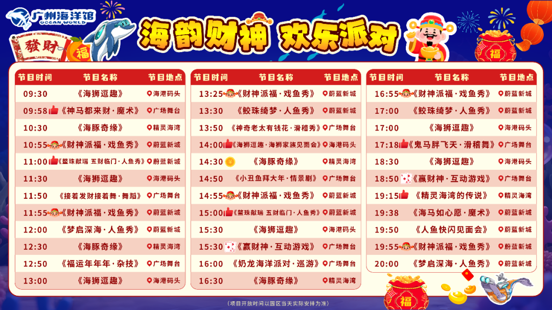 记者从广州海洋馆获悉,新春佳节将至,该馆从早上9点营业至晚上9点,以“来广海 接财运”为主题精心筹备了30多场特色演艺节目,包括水陆财神惊艳同台,年初一到年初七趣味抽奖送黄金,海狮家族首次合体亮相送祝福,还有精彩的魔术、杂技等。